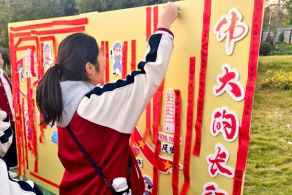学生们将手写的感悟系于红丝带,贴在“大会师”主题背景墙上——“原来团结能破解所有难题”“这5.5公里的征途,让我懂了长征精神不是口号,是并肩前行的勇气”,字里行间满是青春的觉醒与成长,彰显着青年一代听党话、跟党走的坚定决心。