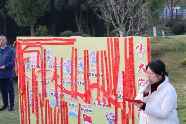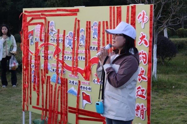 活动尾声的“大会师”仪式点燃全场激情:8支队伍的旗帜同时高举,思政王佩老师现场讲授了行走中的思政课。她感慨道:“历经三个半小时的并肩跋涉与协同奋战,我们170名学生干部与20位带队老师顺利会师于后官湖湿地公园终点,圆满完成了这场‘重走长征路’秋季远足拓展活动!此刻的会师,恰似1936年陕甘宁大会师那般振奋人心——当年,红一、二、四方面军历经千难万险汇聚陕甘宁,宣告长征胜利结束,铸就了永载史册的精神丰碑;今天,我们8支小队跨越‘遵义会议’‘四渡赤水’‘突破腊子口’等重重挑战成功会师,用青春足迹复刻红色记忆,让长征精神在新时代焕发新的光彩。”话音刚落,“传承长征精神,强国有我”的呐喊声震彻湖畔,恰似89年前会宁会师的热血回响。