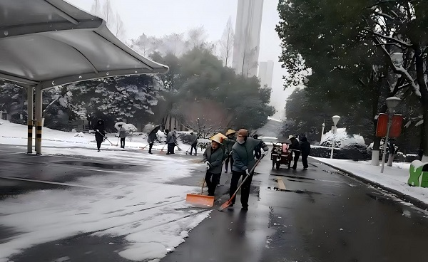 1月20日大雪纷飞,校园银装素裹。天微亮,后勤物业工作人员已全员到岗,手持铁锹、扫帚等除雪工具,奔赴校园各主干道、教学楼、宿舍楼、食堂等区域开展积雪清扫、撒盐工作。大家不畏严寒、分工协作,挥舞工具清除路面积雪与薄冰,漫身洁白的雪花成为校园里最温暖的风景。