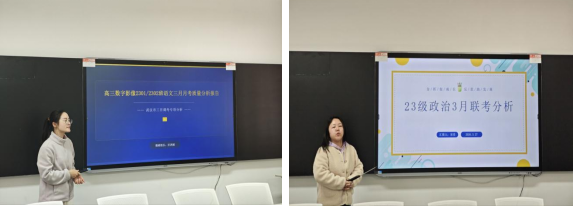 数影2301班班主任景莹、2302班班主任陈甜依次作班级质量分析。两位班主任均表示,后续将深化班科联动,联动各科教师形成育人合力,锁定临界生、头部生与学困生,落实“一生一策”靶向辅导;常态化开展一对一谈心谈话,及时疏导学生考前焦虑,做有温度的教育陪伴;加强班级间经验互鉴,全力缩小班级成绩差距,推动两班齐头并进。